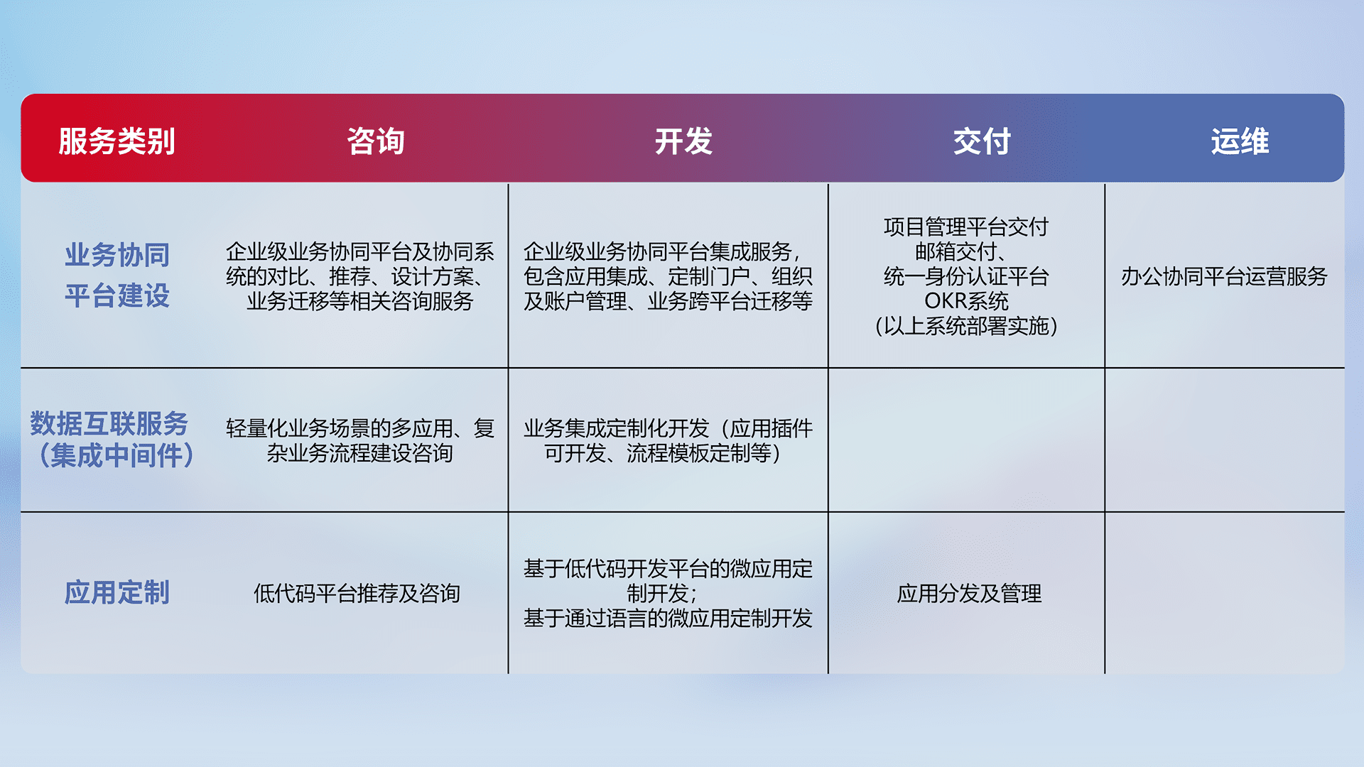 针对钉钉、、、、企微、、、IDaas等平台级产品提供产品的规划、、、方案、、、、交付、、、、定制化开发等服务,,,实现如统一协同办公、、、、智能客户服务、、、、混合会议管理、、智能数据查询、、、等业务场景,,,,实现数字化转型。。