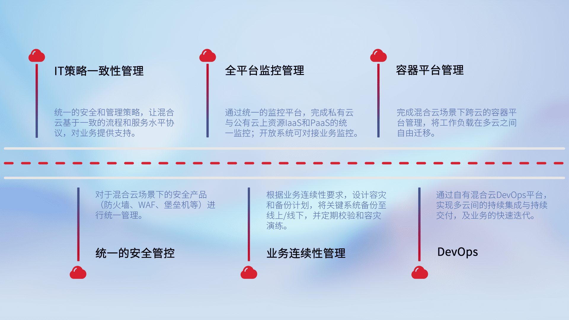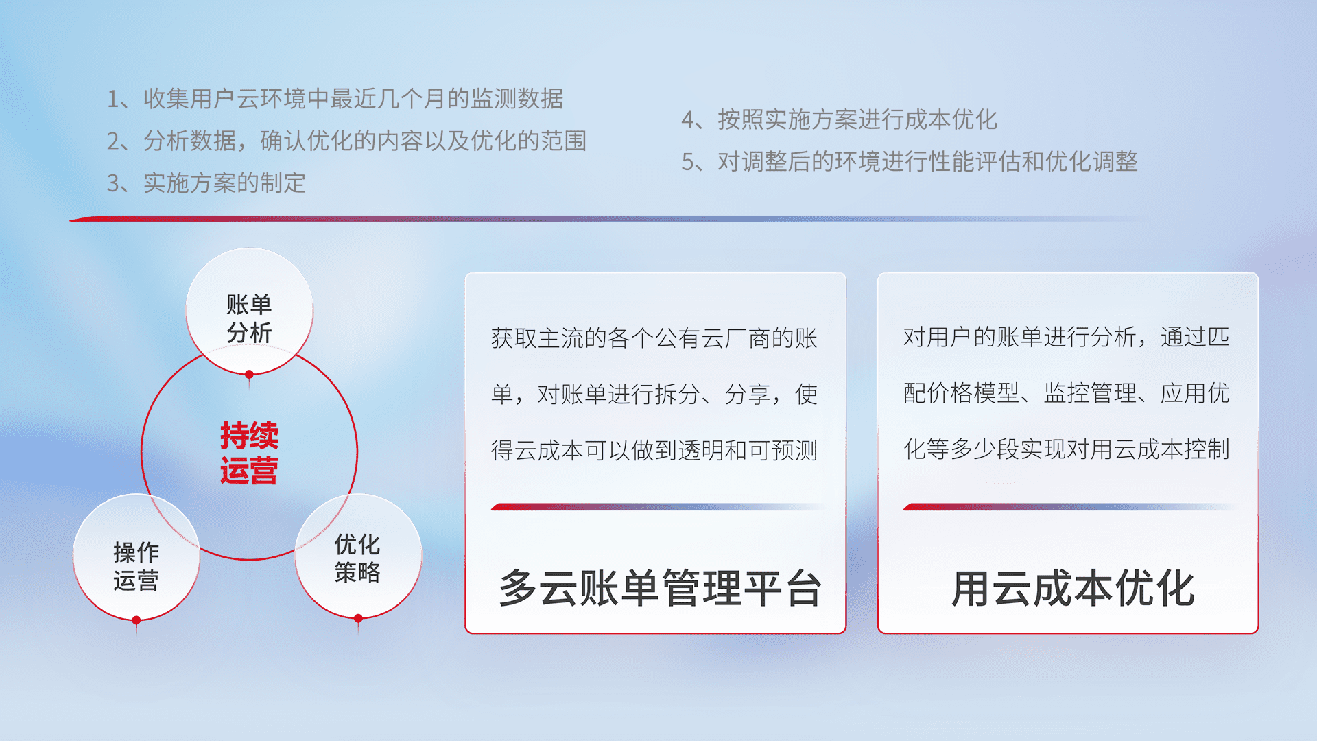 通过多云纳管,,,,以统一的资源数据模型把客户的云资源进行抽象和封装,,,进而实现对多云资源的统一操作,,,保障云资源管理的可靠性、、、、稳定性与可用性。。。。量身定制化运维内容,,,配置、、、开发运维、、、补丁管理、、、、备份、、监控、、、、认证和访问管理、、审计和日常巡检等,,,,保障在用云过程中的可靠度,,,,稳定度以及高可用率。。
